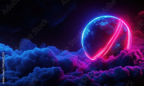 Obraz premium Futuristic neon planet surrounded by vibrant clouds in cosmic space