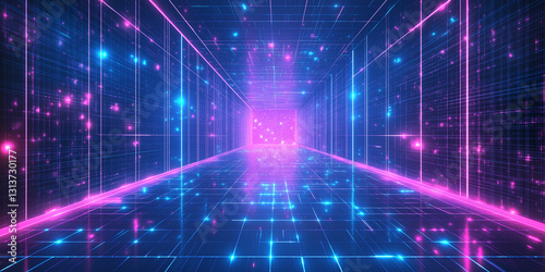 Obraz premium Futuristic neon tunnel with glowing pink and blue grid lines, creating a...