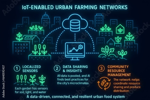 Fototapeta premium Futuristic Neon Urban Farming Network with Glowing Plant Modules for Urban Planning Presentations