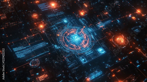 © One King, Obraz premium Futuristic network of glowing data streams and interconnected nodes