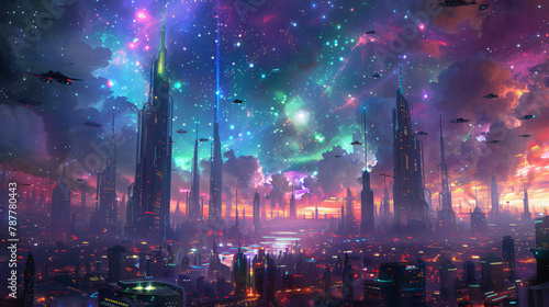 Fototapeta premium Futuristic Night City: Neon Lights, Flying Cars, Skyscrapers