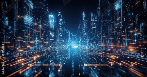 Fototapeta premium Futuristic night cityscape with digital data connections, representing the...
