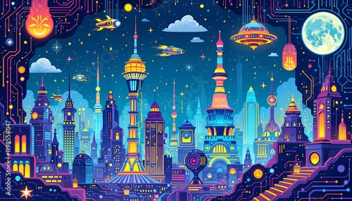 © Mtaufiq, Obraz premium Futuristic Nightscape: A vibrant, neon-lit city skyline under a starry sky, showcasing advanced technology and whimsical architecture.