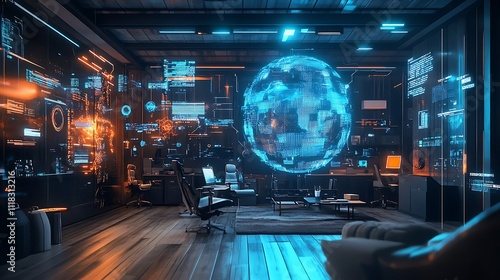 Naklejka premium Futuristic office interior with holographic globe and digital interfaces.