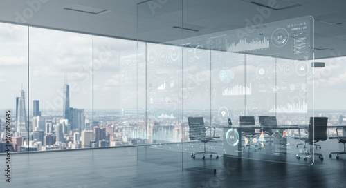 Obraz premium Futuristic office space with integrated data visualization overlooking cityscape
