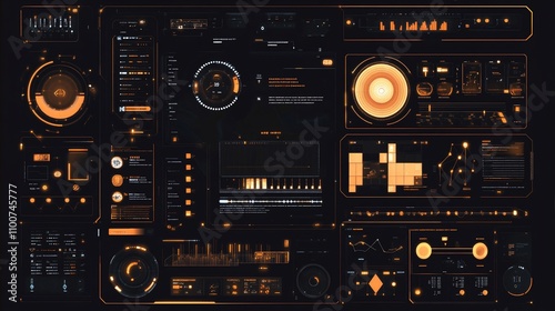 Obraz premium Futuristic orange and black digital interface with various data displays and controls.