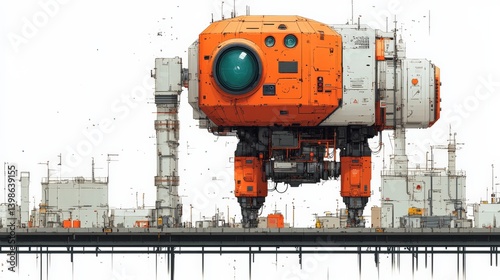 © Udane, Fototapeta premium Futuristic orange robot on a platform overlooking a high-tech industrial landscape