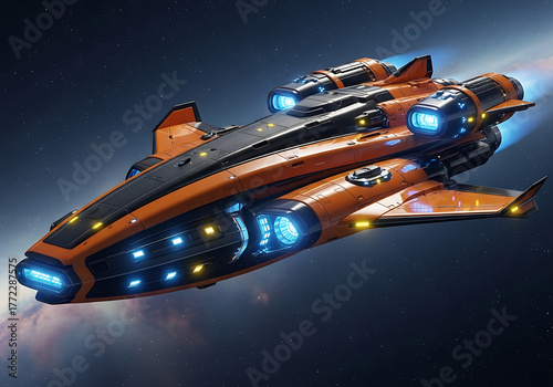 © hsa1, Fototapeta premium Futuristic orange spaceship with glowing blue lights soaring through space
