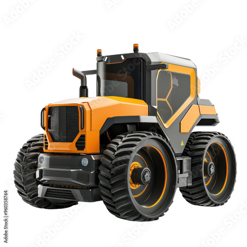 © Nattadesh, Obraz premium Futuristic orange tractor with large wheels, designed for modern agriculture and showcasing innovative technology.