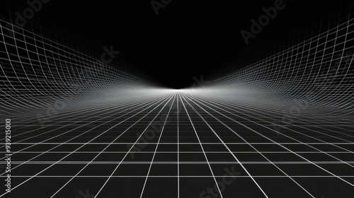© Imron, Naklejka premium Futuristic perspective grid box. Abstract wireframe with white grid line on black background. Virtual reality landscape in 80s 90s digital style. Vector illustration