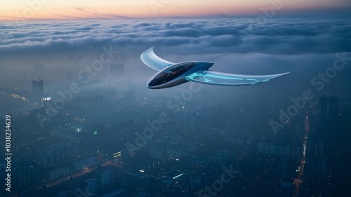 Fototapeta premium Futuristic plane with transparent wings above city lights and clouds