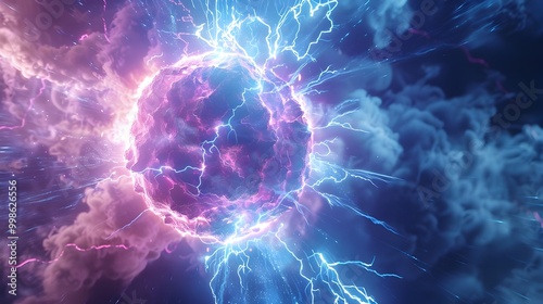 © Bussakon, Obraz premium Futuristic Plasma Bomb Explosion with Glowing Blue and Purple Energy Waves Radiating Outward