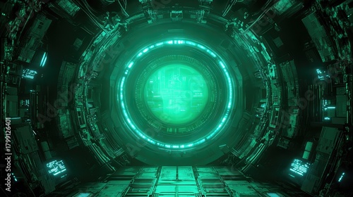 Fototapeta premium Futuristic portal opening in a green sci fi tunnel