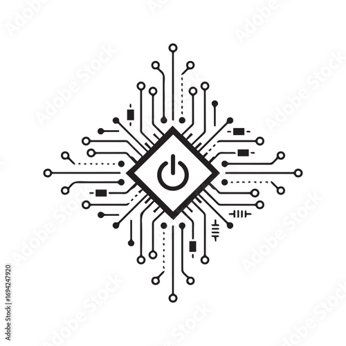 Obraz premium Futuristic power button symbol on a CPU. Abstract technology vector with circuit board lines. Black techno graphic for tattoo or logo design, isolated on white.