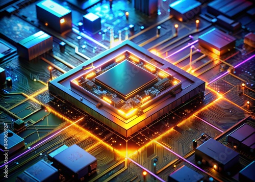 © Adisorn, Fototapeta premium Futuristic Processor Chip: Aerial View of Advanced Circuit Board Technology