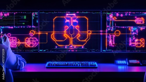 © A4719, Obraz premium Futuristic Programmer Working on Neon Circuit Board Design on Multiple Monitors