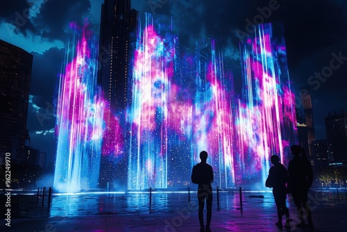 © spyrakot, Obraz premium Futuristic Projection Mapping Fireworks Display in Cityscape - Modern Technology Innovation