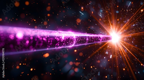 Naklejka premium Futuristic purple laser beam piercing a black backdrop surrounded by vibrant flares and radiant light rays creating a captivating cosmic and technological visual display