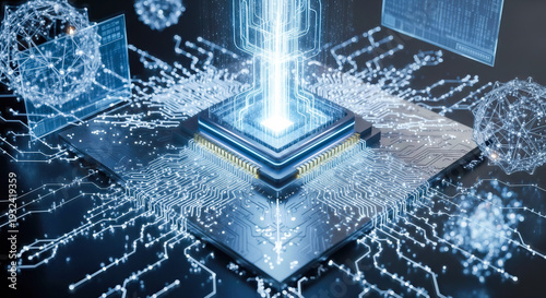 © Celt Studio, Naklejka premium Futuristic quantum computer processor chip with glowing blue data streams and complex circuit board connections representing artificial intelligence evolution