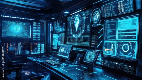 © SepazWorks, Obraz premium Futuristic Quantum Computer Setup with Vibrant Qubi