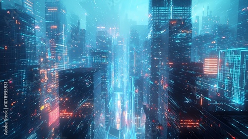 Obraz premium Futuristic Quantum Internet Metropolis with Glowing Data Streams Connecting Cityscape