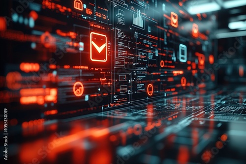 © CahPapat, Obraz premium Futuristic red and blue digital interface with icons.