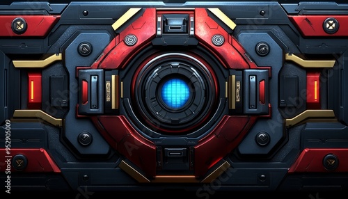© Nob, Fototapeta premium Futuristic Red and Gold Technology Panel with Blue Glowing Lens