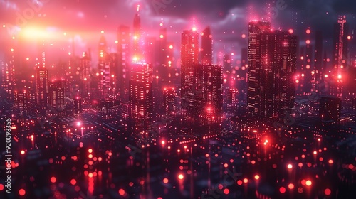 © jerseykamu, Obraz premium Futuristic red city skyline with glowing lights.