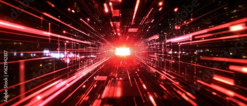 Naklejka premium Futuristic Red Digital Tunnel with Glowing Lights and Geometric Lines for...