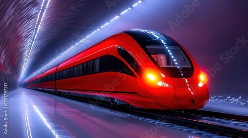 © yusufadi, Obraz premium Futuristic Red High-Speed Train Emerging from a Tunnel