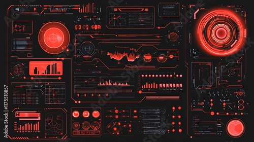 © lisa, Obraz premium Futuristic Red Interface Displays Data Graphs And Charts