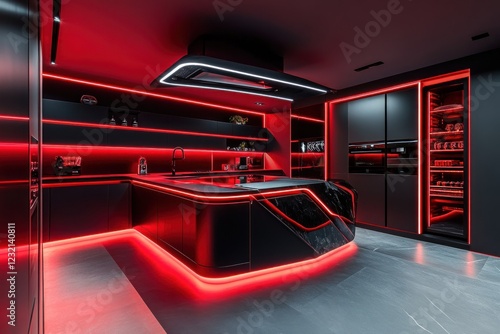 Obraz premium Futuristic Red Lit Modern Kitchen Design