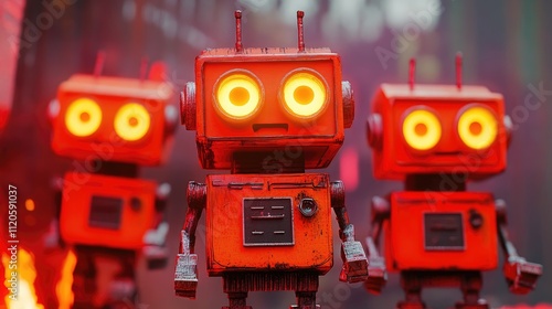 Fototapeta premium Futuristic Red Robots with Glowing Eyes in a Dystopian Industrial Setting