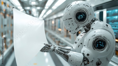 Fototapeta premium Futuristic Robot Analyzing Data Sheet in HighTech Environment Advanced...