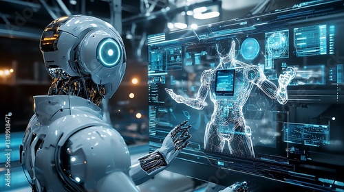 © Asma24, Fototapeta premium Futuristic Robot Analyzing Digital Interface in High-Tech Laboratory Setting