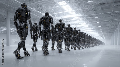 © Viktoriia, Obraz premium Futuristic robot army marching in industrial facility with precision