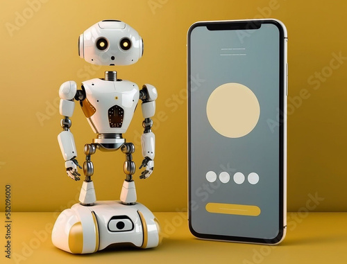 Fototapeta premium Futuristic robot beside screen of smartphone. Concept of chatbot with...