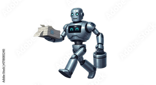 Fototapeta premium Futuristic robot carrying papers and paint bucket, a symbol of automation in various tasks, reflecting efficiency and modern technology solutions