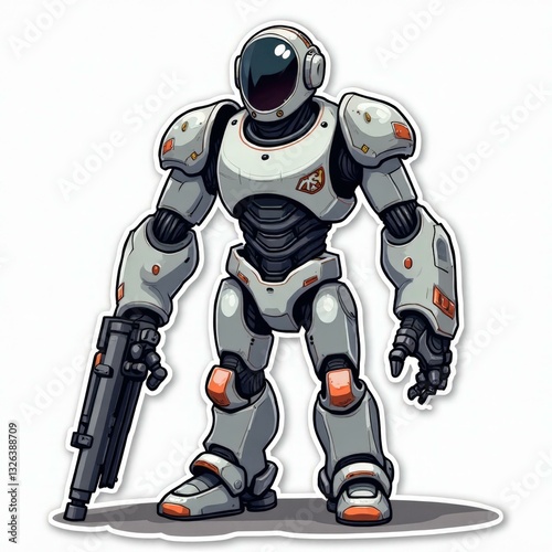 © ADog, Naklejka premium Futuristic Robot Character Illustration with a Stylized Design, Featuring Orange Accents and a Gun, Set against a Gray Background