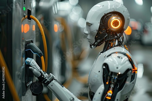 © kvladimirv, Fototapeta premium Futuristic Robot Charging Electric Car at High-Tech EV Station with Glowing Lights