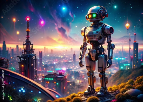 Fototapeta premium Futuristic Robot Exploring a Sci-Fi Landscape with Advanced Technology and Neon Lights at Night