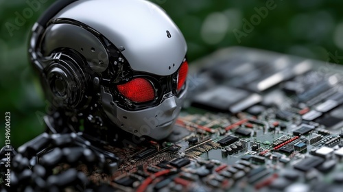 Fototapeta premium Futuristic robot head on circuit board, close-up view. Intricate details of metallic parts, glowing red eyes, and complex electronic components