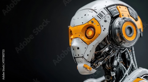 Fototapeta premium Futuristic robot head with vibrant orange accents and intricate mechanical details, showcasing advanced technology