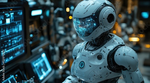 Fototapeta premium Futuristic robot in a high-tech factory control room.