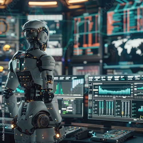 © Erik, Fototapeta premium Futuristic robot monitoring data on multiple screens in a control room.