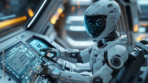 © ABIDZAR ALFAREZ, Fototapeta premium Futuristic robot pilot operating spaceship controls.