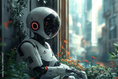 Fototapeta premium Futuristic robot seated among vibrant flowers in a bustling urban setting