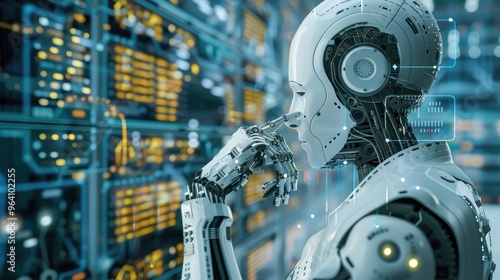 Fototapeta premium Futuristic Robot Thinking in Data Center