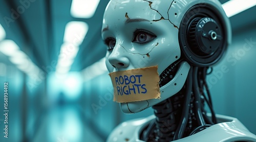 Fototapeta premium Futuristic robot with expressive features advocating for artificial intelligence rights