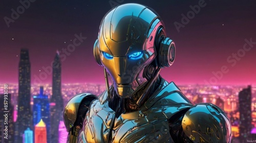 Fototapeta premium Futuristic Robot with Glowing Blue Eyes in Cityscape